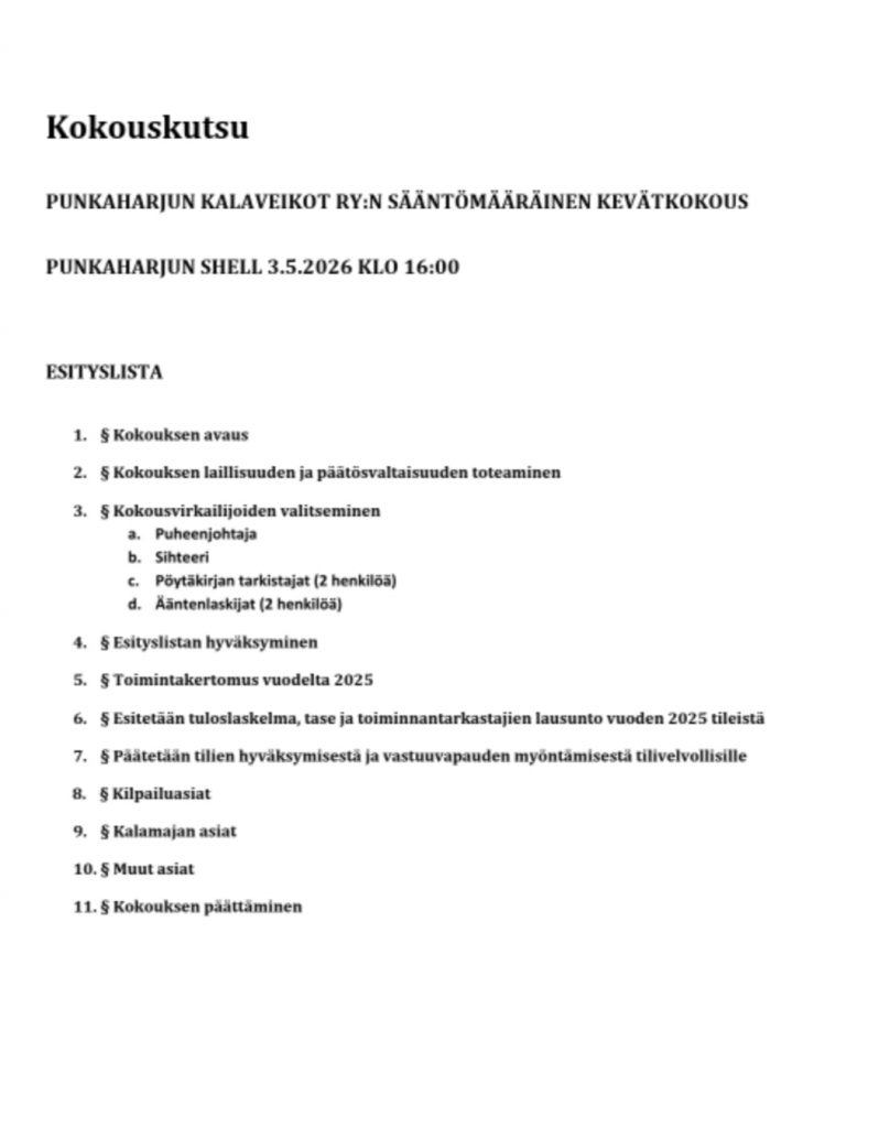 - Punkaharjun kalaveikot ry:n sääntömääräisen syyskokouksen 2024 kutsu ja esityslista: